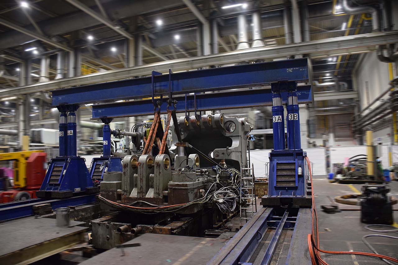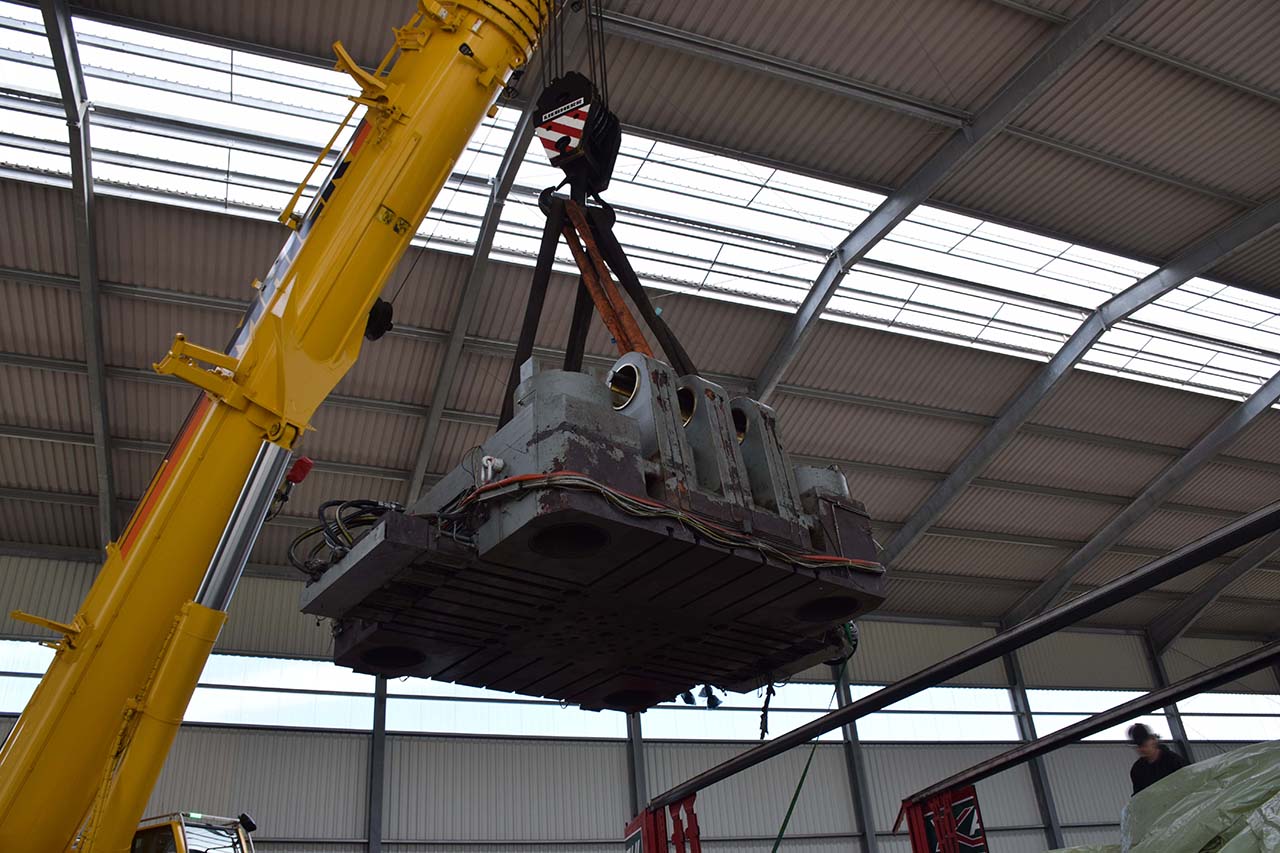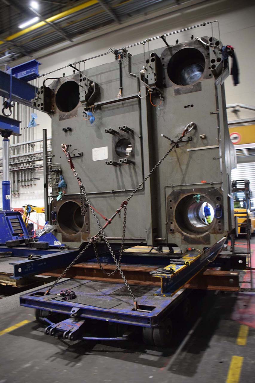 Ahora llegó el momento de la fase de planificación del complejo desmantelamiento y traslado de las dos celdas de fundición. También en este caso, fiss machines prestó un valioso apoyo con sus 30 años de conocimientos especializados. Juntos, se analizaron los problemas específicos que podían surgir durante el desmantelamiento y el transporte y se elaboraron soluciones sensatas. La ruta desde las instalaciones de la fábrica supuso un reto especial. La Bühler Evolution B 420 D tiene un peso total de 270.000 kg. El desmantelamiento y la retirada de los pesados componentes de la máquina fueron, por tanto, complicados. La placa cilíndrica, con un peso total de 73.000 kg, sólo se pudo desplazar después de asegurar la entrada con un sótano con 100 puntales.