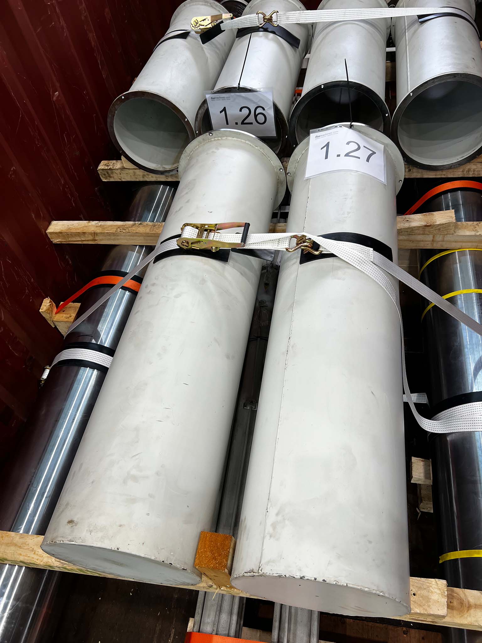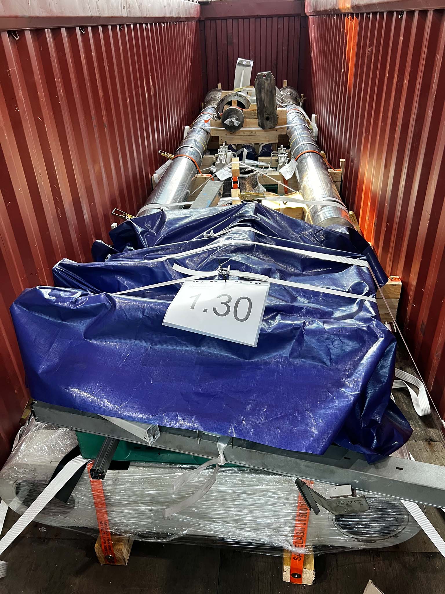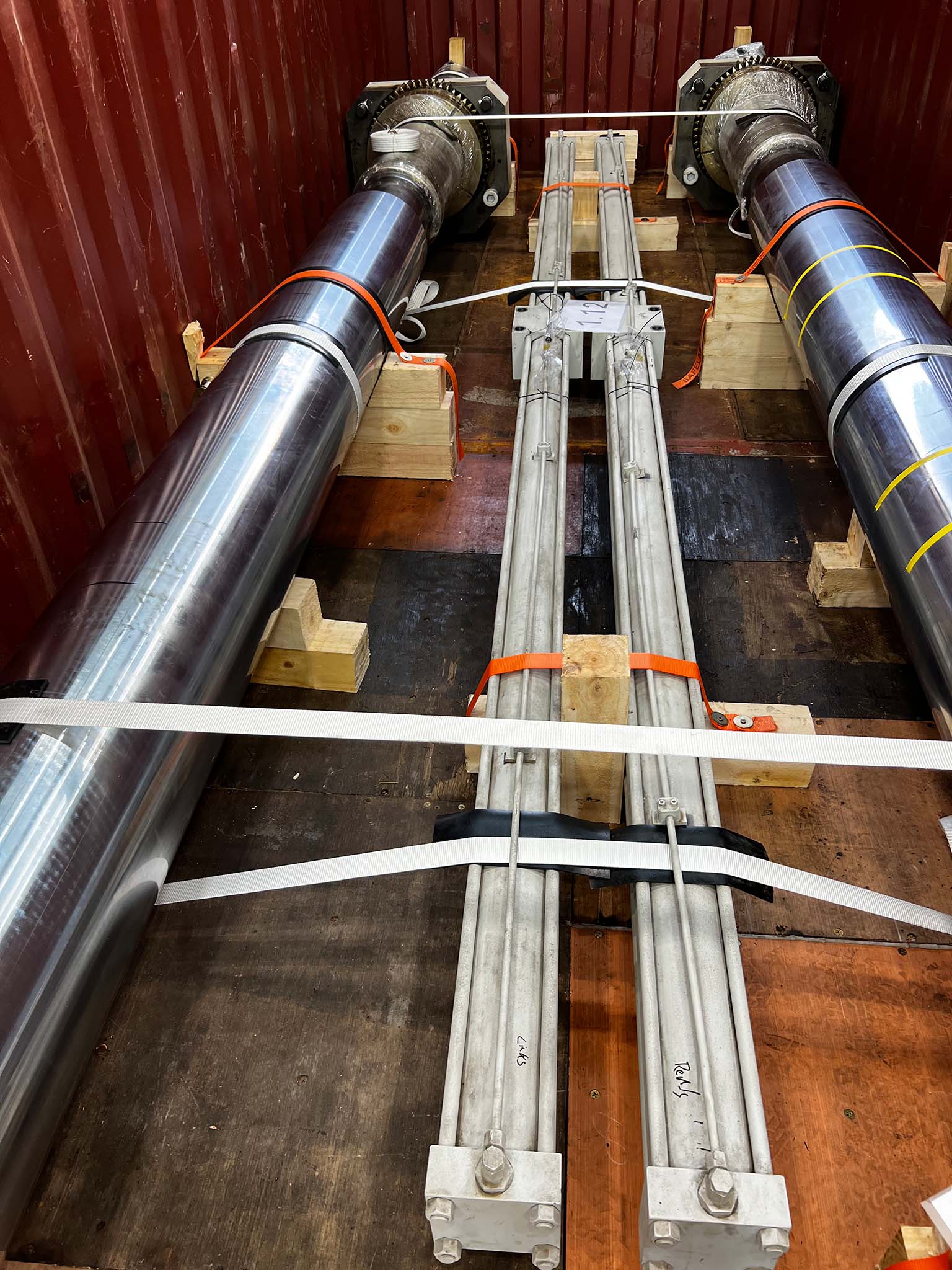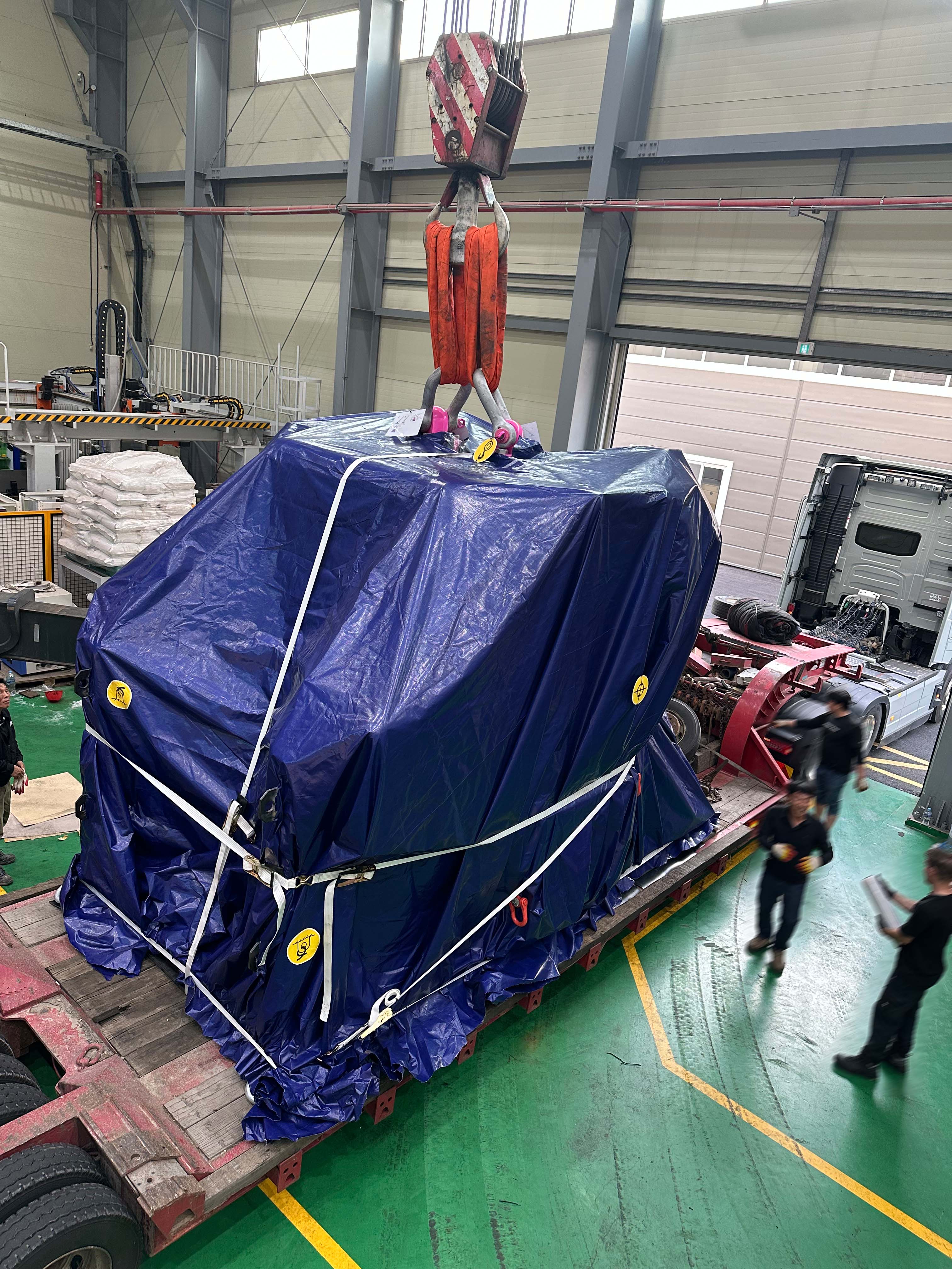 Tras el desmontaje, las piezas individuales de la máquina se cargaron en contenedores especiales y en camiones de carga pesada. Para garantizar un transporte seguro, los componentes se prepararon y aseguraron adecuadamente para cumplir con los altos requisitos del transporte de carga pesada.